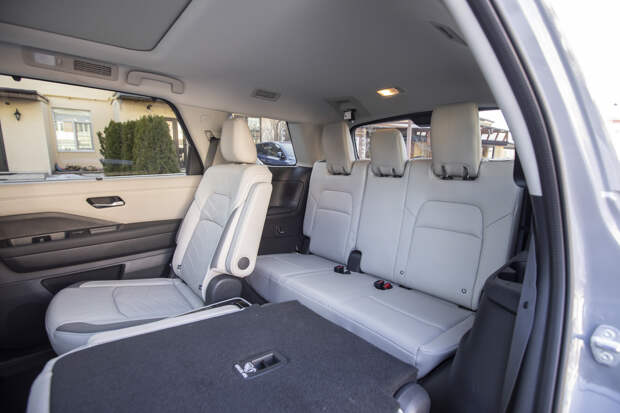 Конечно, на третьем ряду места чуть меньше, чем в рекордно просторном Терамонте, но намного больше, чем в той же Mazda CX-9. В отличие от неё, Pathfinder вполне может перевозить в багажнике взрослых людей, не испортив им такой поездкой весь день. Да и нельзя даже сказать, что на последнем ряду ощущаешь себя в грузовом отделении — у кроссовера Nissan остаётся вполне полноценный багажник. И не менее объёмный, чем у исполина Volkswagen!
