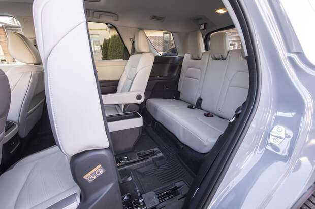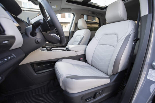 Надеюсь, что хотя бы электронные ассистенты безопасности откалиброваны не тем человеком, что программировал подсветку и настройку погоды. И если с софтовой частью есть многочисленные вопросы, то всё аналоговое и механическое в этом салоне сделано безупречно. Обстановка собрана качественно и в движении не издаёт лишних звуков, как многие навороченные трёхрядные интерьеры даже у премиум-марок. Сиденья удобные, места достаточно, шумоизоляция тщательная — пассажирам хорошо, где бы они ни находились.
