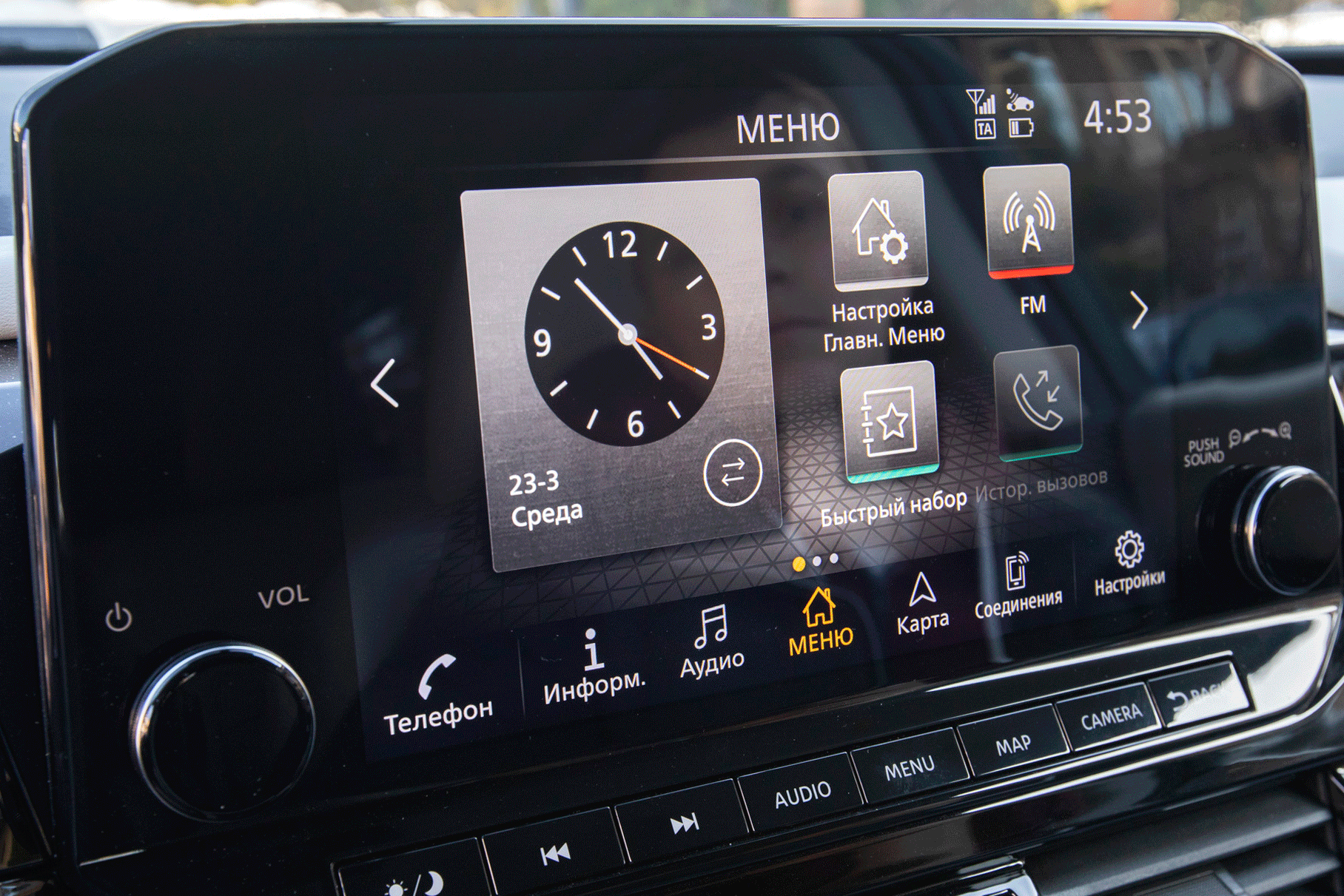 Откровенно подкачала лишь мультимедийка. Относительно размеров салона дисплей маленький, но при этом не слишком эстетично выдаётся за контуры передней панели (это, конечно же, субъективно). При этом он расположен под таким углом к взгляду водителя, что поверхность экрана сильно бликует — зачастую отражение лица пассажира видно отчётливее, чем сам интерфейс. Который неплохо скомпонован и прорисован, но впечатление портит сенсор с низкой чувствительностью, и жуткие «фризы» при пролистывании экранов. В общем, пользоваться системой хочется как можно реже.