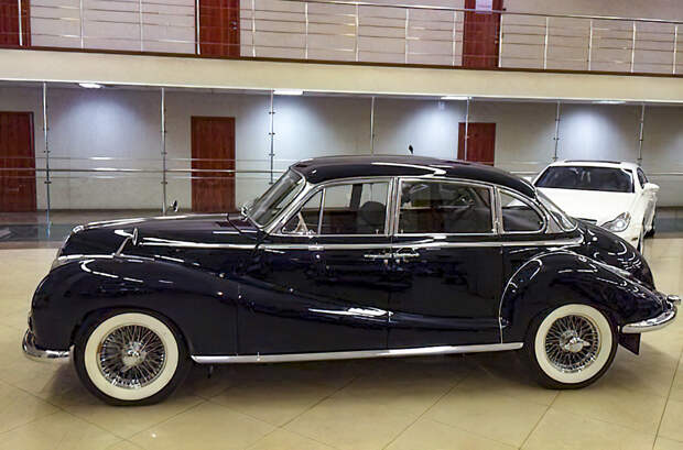 BMW 502 дебютировал в 1954 году. За десять лет производства автомобиль, который создавали на базе довоенных разработок, выпускали в кузовах седан и кабриолет. Модель получила необычный для того времени дизайн экстерьера, который отличался удлиненными передними крыльями, переходящими в задние фонари. За подобный стиль машину прозвали «ангел барокко».