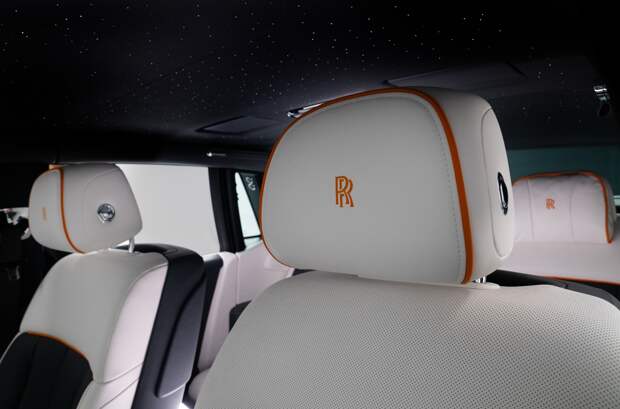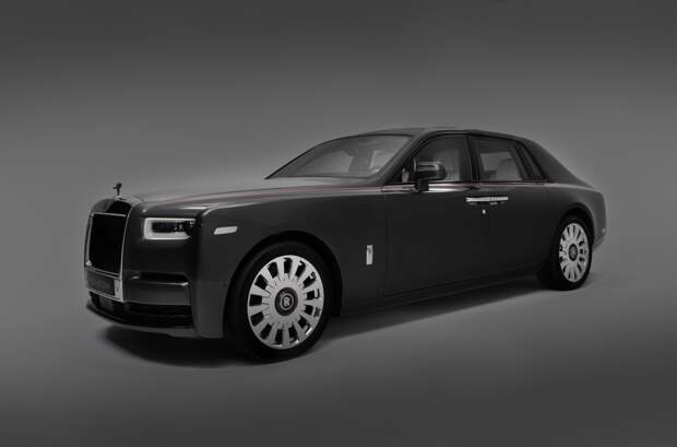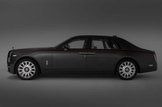 Первый Phantom с «вуалью» окрашен в темно-серый Gunmetal, который сочетается со светло-серым капотом, статуэткой Spirit of Ecstasy из карбона и оранжевыми акцентами. В отделке салона применена двухцветная кожа. Все блестящие детали выполнены в цвете антрацит.