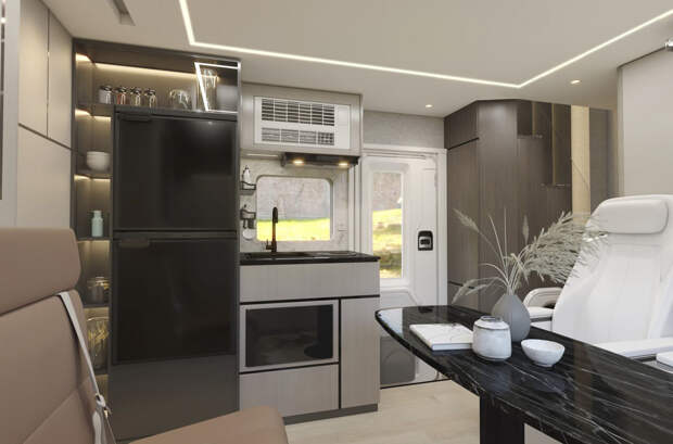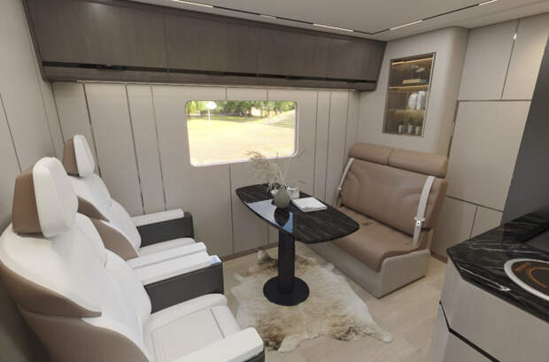 На первом этаже автодома разместилась кухня, зона отдыха и санузел. Наверху находится гостиная, спальня и откидная терраса. В базовую комплектацию дома на колесах входит система фильтрации и нагрева воды, теплый пол, кондиционер, а также бытовая техника и аудиосистема. Вся электроника питается от аккумулятора емкостью 29 киловатт-часа, заряд которого можно пополнить за счет солнечных батарей, зарядных станций или двигателя внутреннего сгорания.