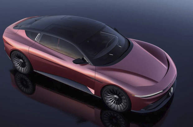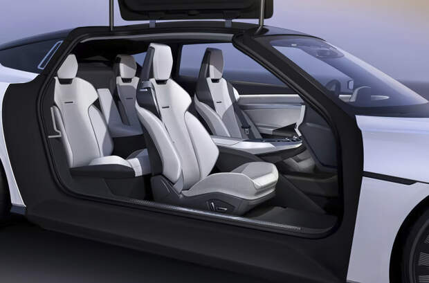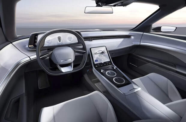 В салоне установлены четыре раздельных кресла с развитой боковой поддержкой, физические кнопки практически отсутствуют, панель приборов — полностью цифровая, а еще один экран установлен по центру и плавно переходит в центральную консоль. Справа от водителя можно заметить нишу — по всей видимости, это беспроводная зарядка для смартфона.