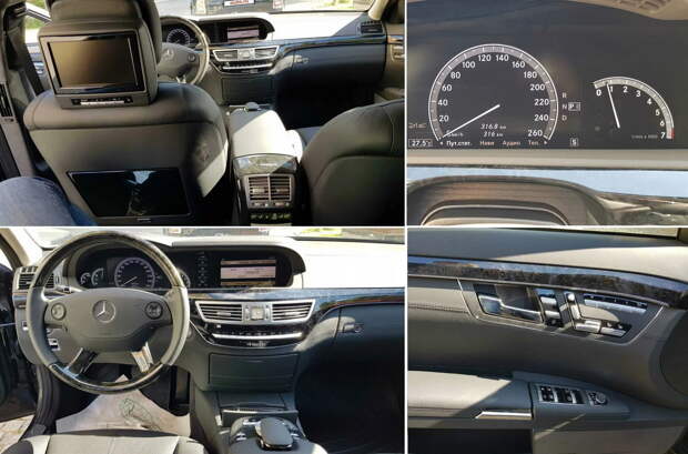Судя по бамперам и колёсным дискам, у седана есть характерный для дорестайлинговых машин заводской пакет AMG. Четырёхместный салон — редкость для Mercedes-Benz S-Класса, сконфигурированных подобным образом. Цветовые решения стандартные: кузов чёрного цвета, салон отделан тёмной кожей и деревом.
