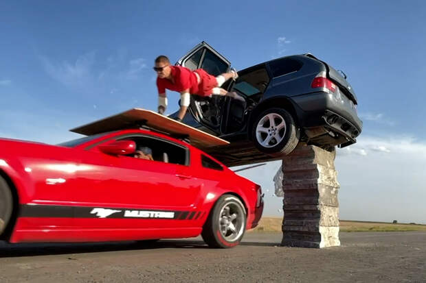 Для выполнения трюка BMW X5 подняли на пару метров с помощью бетонных блоков. Разогнавшись на крыше Ford Mustang, Чеботарев сумел пролететь сквозь салон внедорожника.